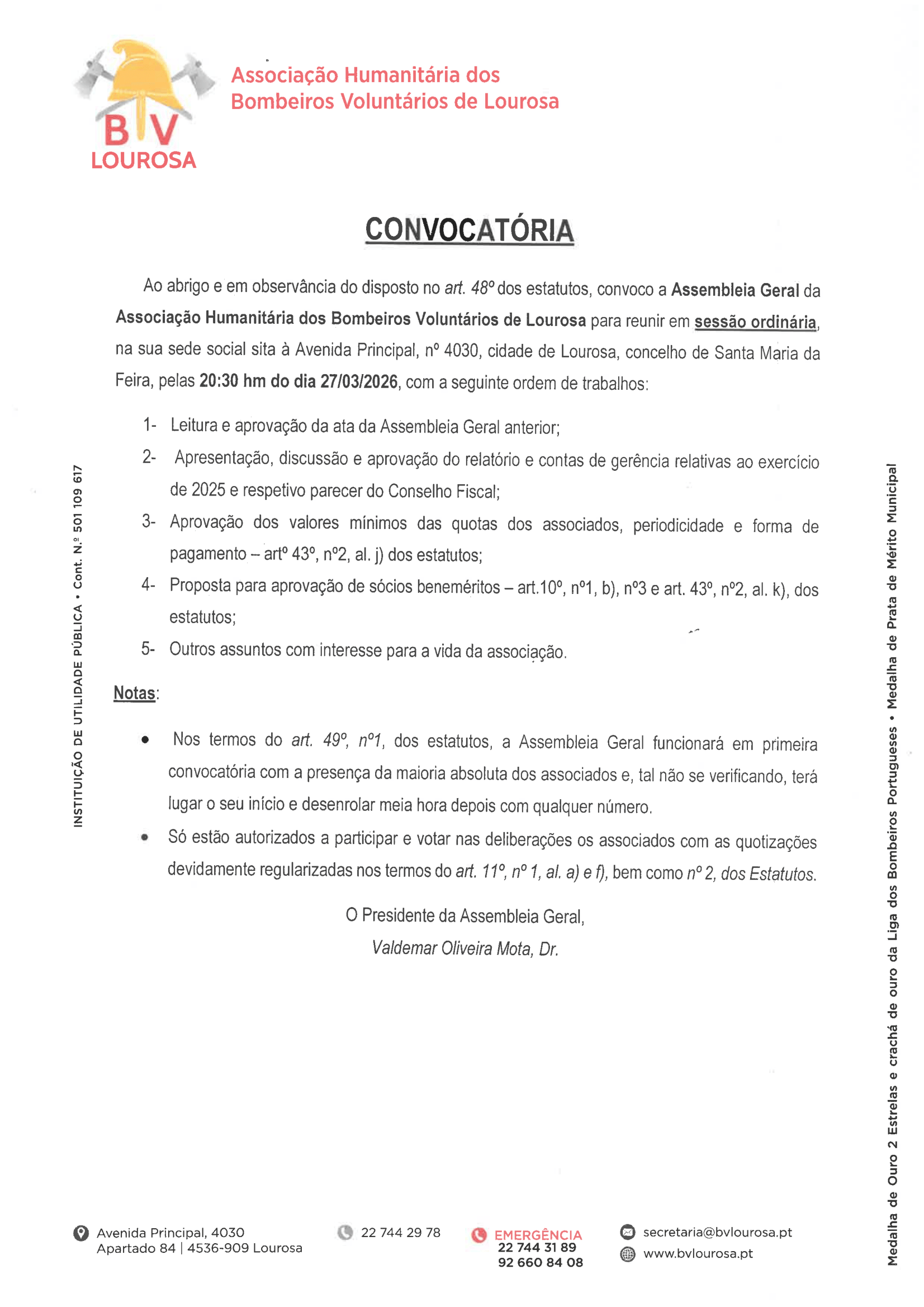 Ao abrigo e em observância do disposto no art. 48º dos estatutos, convoco a Assembleia Geral da Associação Humanitária dos Bombeiros Voluntários de Lourosa para reunir em sessão ordinária, na sua sede social sita à Avenida Principal, nº 4030, cidade de Lourosa, concelho de Santa Maria da Feira, pelas 20:30 hm do dia 27/03/2026, com a seguinte ordem de trabalhos:
