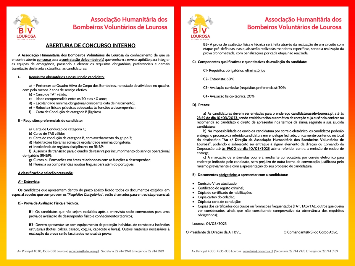 A Associação Humanitária dos Bombeiros Voluntários de Lourosa dá conhecimento de que se encontra aberto concurso para a contratação de bombeiro(s) que venham a revelar aptidão para integrar as equipas de emergência, passando a elencar os requisitos obrigatórios, preferenciais e demais tramitação destinada a classificar as candidaturas: