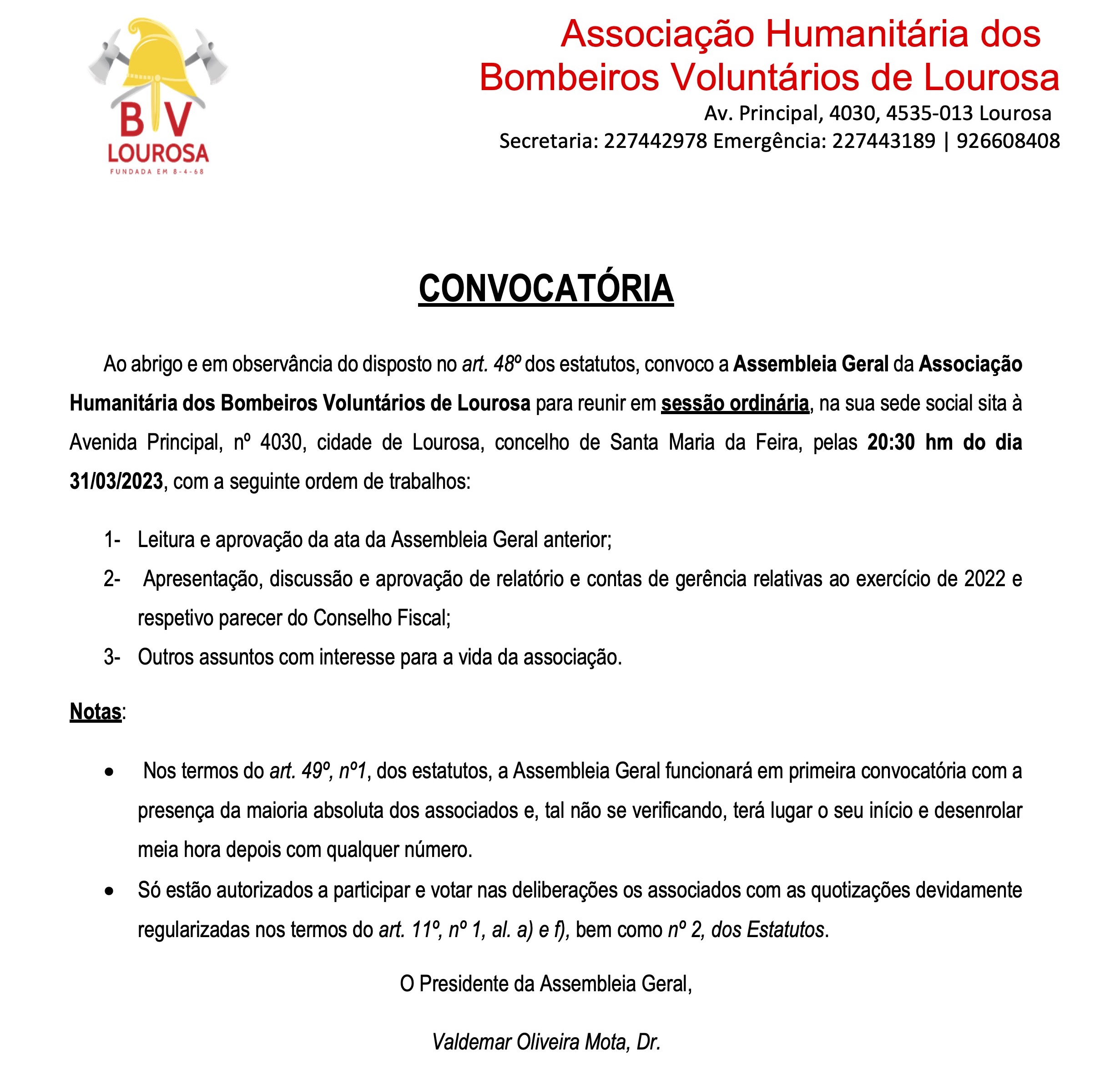Ao abrigo e em observância do disposto no art. 48º dos estatutos, convoco a Assembleia Geral da Associação Humanitária dos Bombeiros Voluntários de Lourosa para reunir em sessão ordinária, na sua sede social sita à Avenida Principal, nº 4030, cidade de Lourosa, concelho de Santa Maria da Feira, pelas 20:30 hm do dia 31/03/2023, com a seguinte ordem de trabalhos: